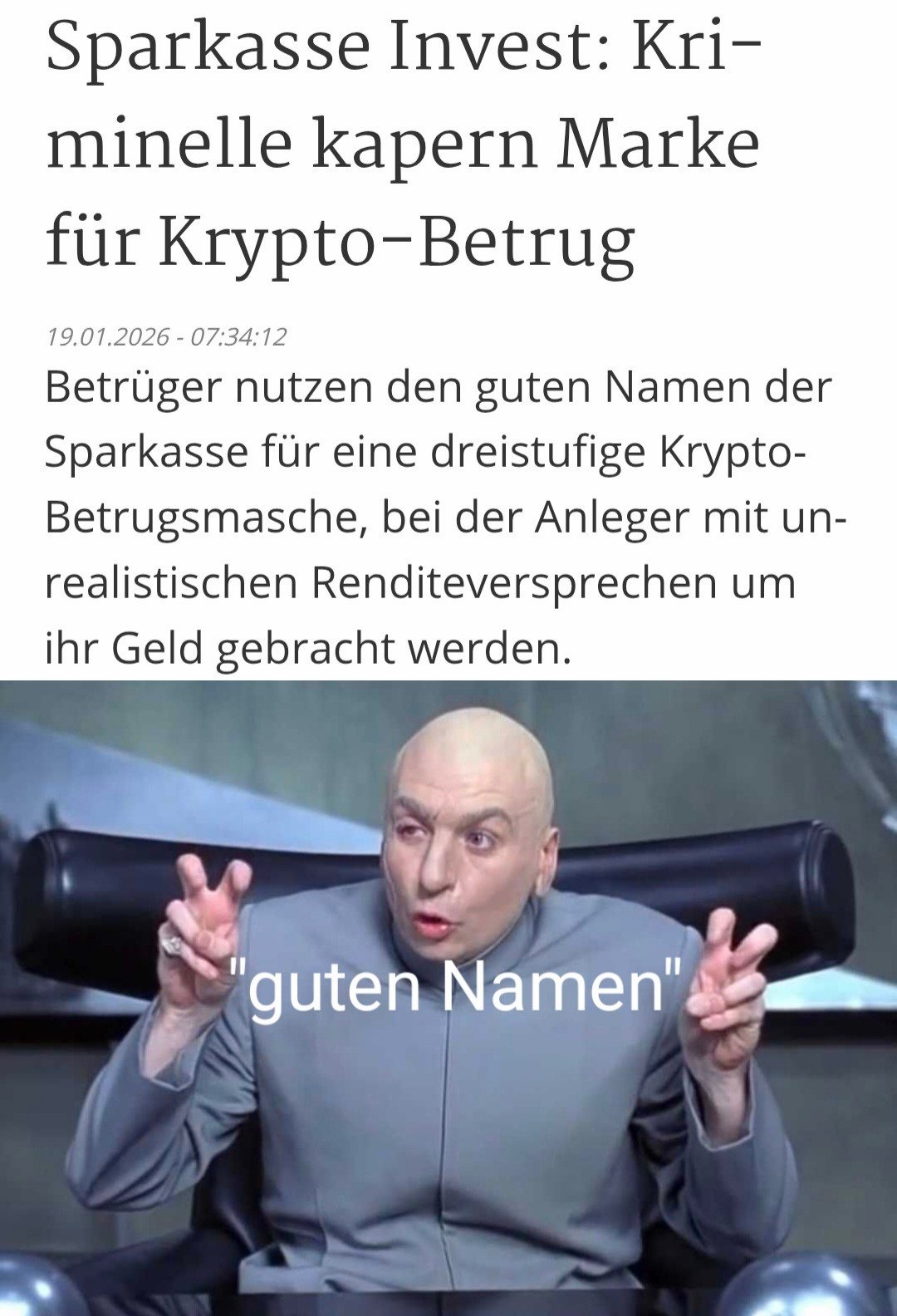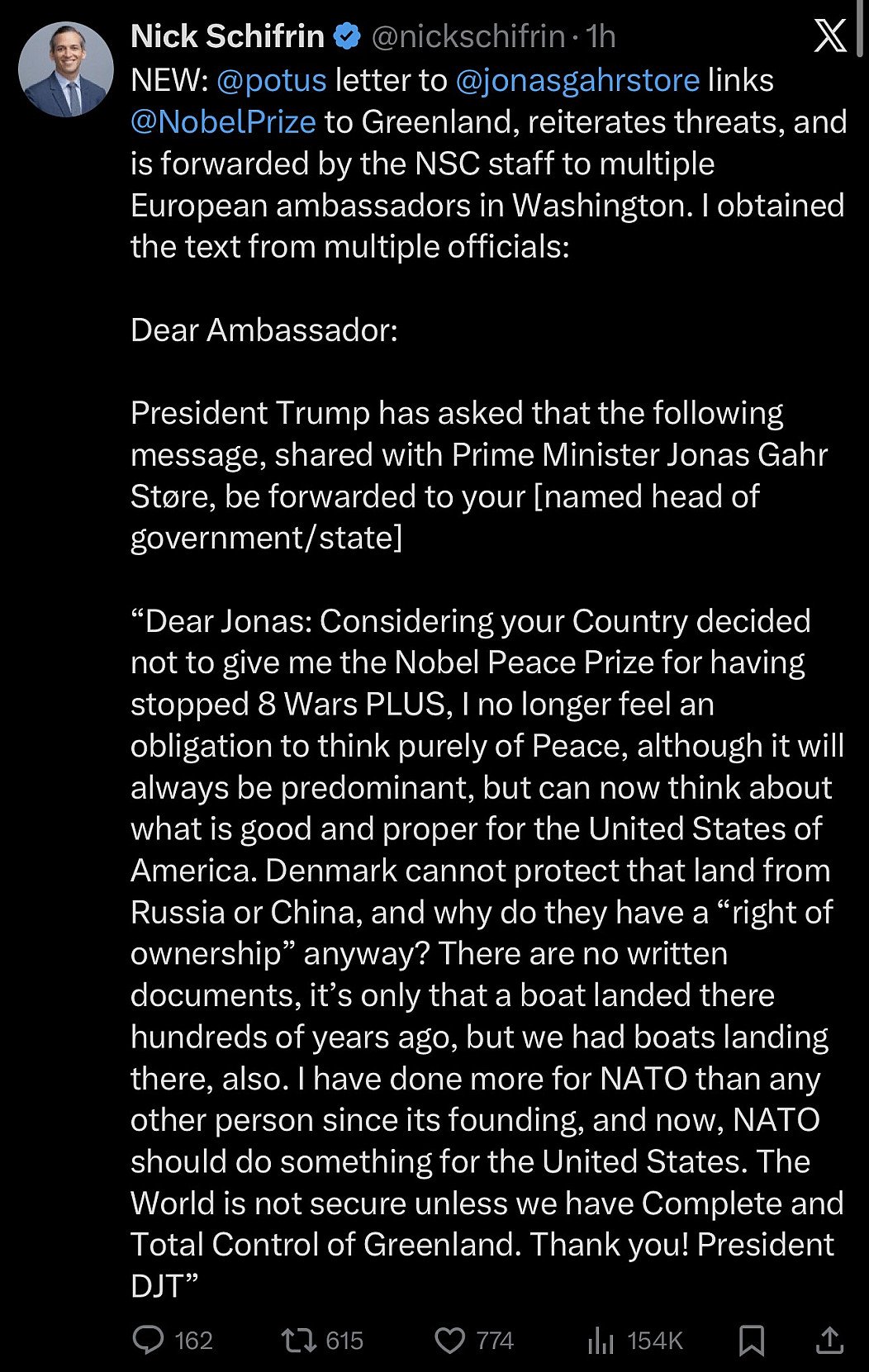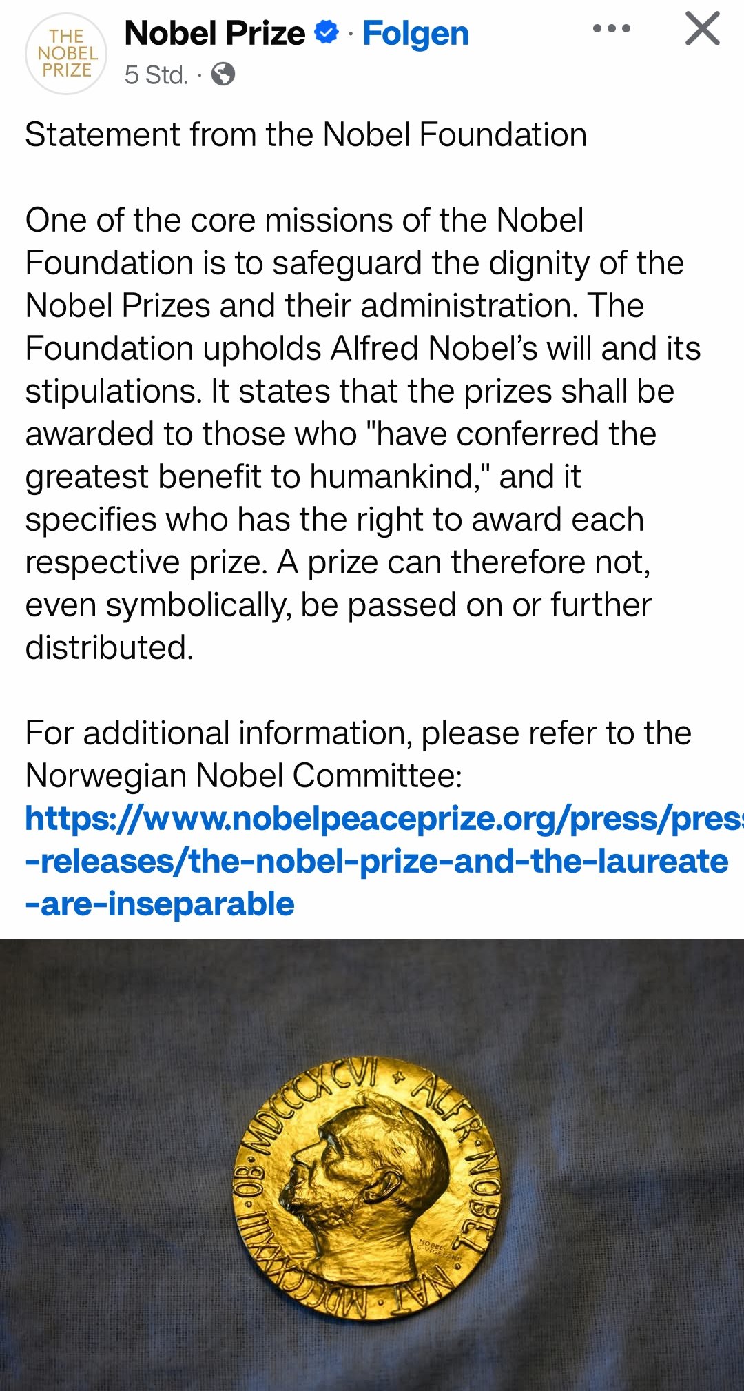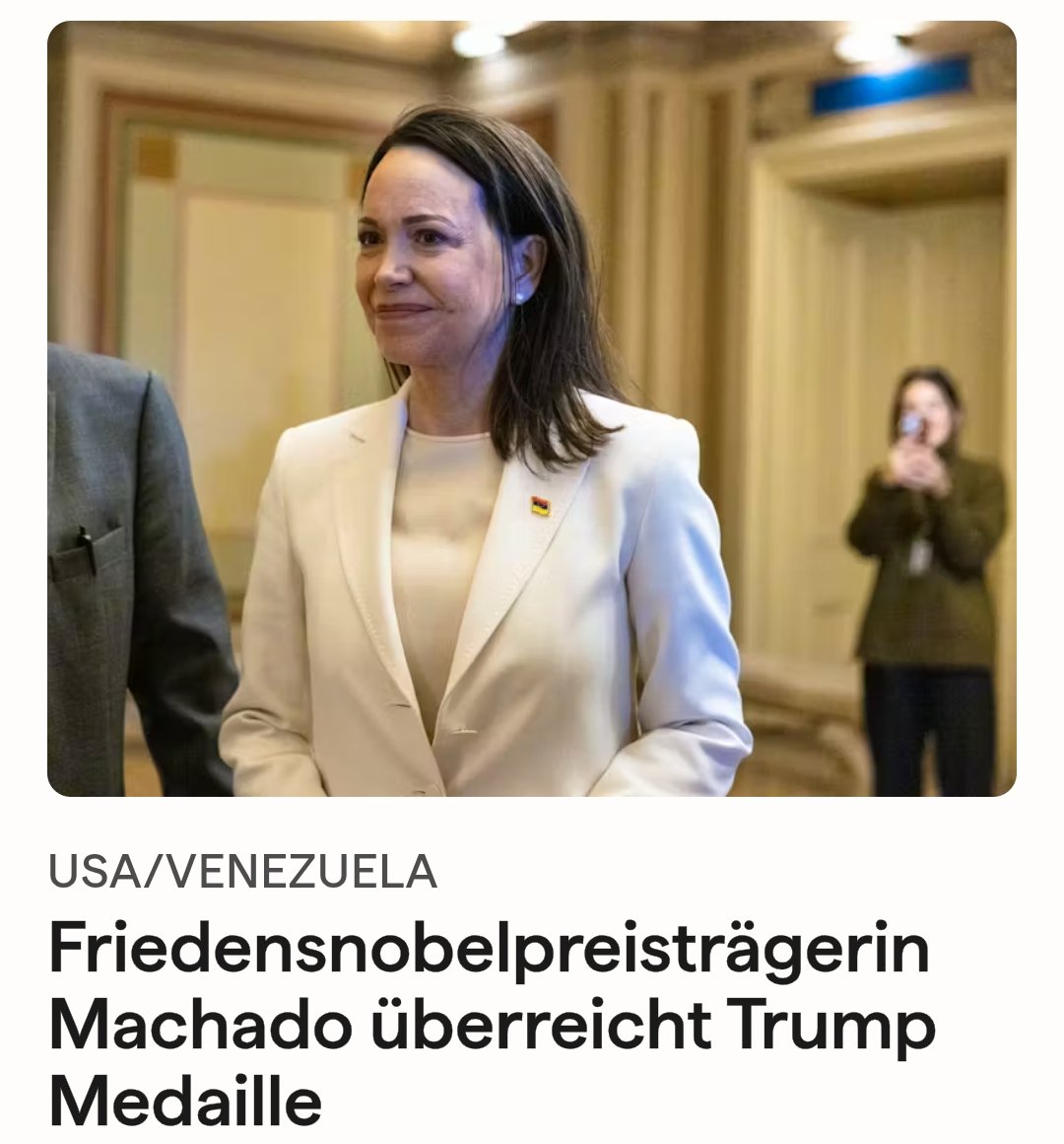 13 Jahre Diktatur unter Maduro. Europa tut nichts. Maria Corina Machado wird von der Wahl ausgeschlossen, muss teilweise untertauchen. Europa vertreten durch Norwegen verleiht ihr den Friedensnobelpreis und tut sonst nichts. Machado widmet Trump ihren Preis, weil er der Einzige ist, der etwas gegen die Narco-Terroristen unternimmt. Europa spottet und tut sonst nichts. Trump nimmt den Hurensohn in einer brillanten Militäraktion fest und übergibt ihn sofort den zivilen Justizbehörden, befreit damit Venezuela von seiner Terrorherrschaft. Europa beklagt die Verletzung des Völkerrechts durch Trump und tut sonst nichts. Machado übergibt aus Dankbarkeit Trump ihre Friedensnobelpreismedaille. Europa pocht darauf, dass die Medaille nicht übertragbar sei und tut sonst nichts.
